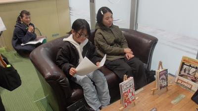 30分前からリハーサルを行いました。3分間で本の紹介することはたいへんなことですが、よむよむクラブでの経験を活かしながら、準備をバッチリしてくれました。頼もしい2人でした。