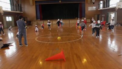 2年生の体育ではサーキットトレーニングに取り組んでいますが、今回は子どもたち自身がそのコースを考え、設営しているようです。なわとびフェスで使用しているなわとびでジグザグコースを作ったり、マーカーを置いて1周回るなどの決めごとを作ったりして、チームごとにトレーニングコースを完成します。