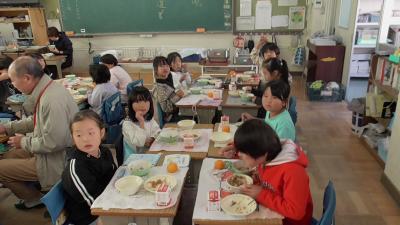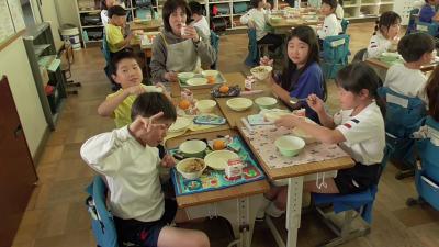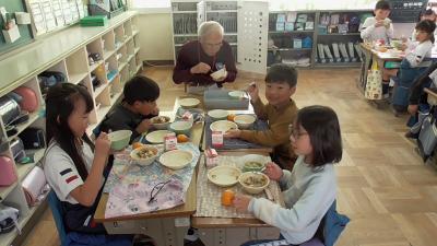 子供たちが地域の方、特に直接的にお世話になっているボランティアさんと給食の時間に交流できることは、地域の方々との絆を深めるために、いい機会と感じています。これからも多くの方々を給食にお招きして、子供たちがボランティアさんをより身近に感じ、感謝と尊敬の念をもって接することができるように願っています。給食もとってもおいしいですから、笑顔満開です。