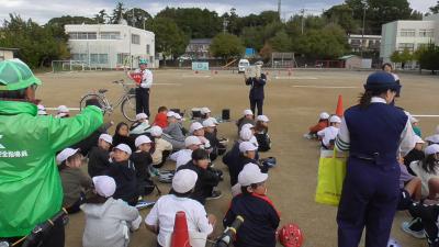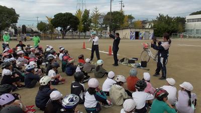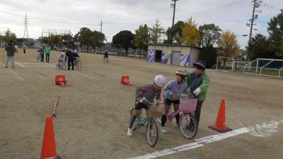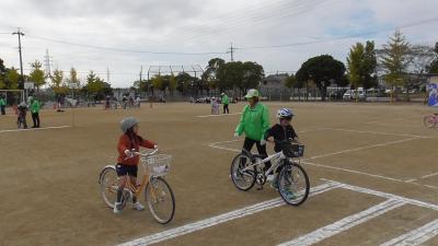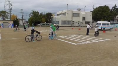 豊橋市では、1、3、5年の奇数学年は必須で交通安全教室が行われています。1年生は春に横断歩道の渡り方、そして3年生は自転車の安全な乗り方を学びます。11月12日は天気にも恵まれ、運動場いっぱい使って、実習を行うことができました。運動場の線引きは3年生の先生方が朝早くから行ってくれました。