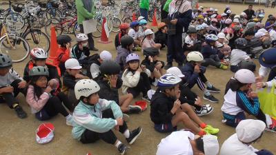 続いて子どもたちに持ってきてもらった自転車で安全点検を行いました。今日もベルの調子がよいようです。でも、ベルを使わないよう、自転車に乗ることが安全にはよいようです。