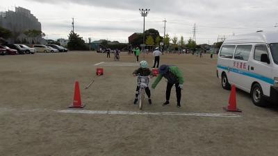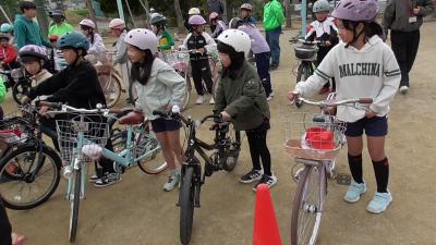 続いて自転車の安全な乗り方と自転車点検等について、学びました。自転車の左側から乗るのがげんそくです。