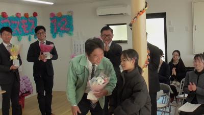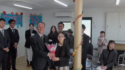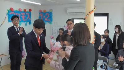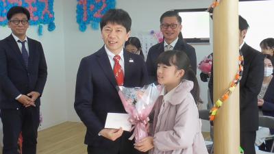 コスモスクラブに在籍する磯辺小の子どもたちから、「コスモスクラブ」の新たなクラブ棟の建設にご尽力いただいた多くの方々に感謝のお手紙と花束が渡されました。