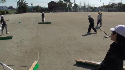 前日は久々に本降りの雨であったので、運動場の東側は昼休みでもまだ「じゅるく」、「ふんごむ」状態が残っていたので、4年生のボランティアさんたちが、運動場の整備をしてくれてました。