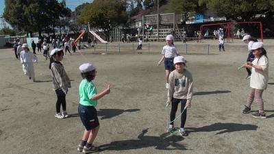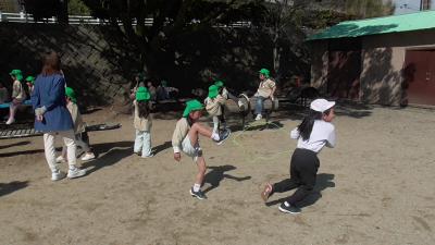 なわとび対決の周りでは、今日もいくつかのグループがおにごっこやなわとびを楽しんでいました。よい天気に恵まれ、みんな気持ちよさそうです。