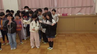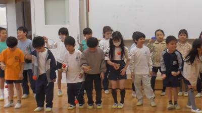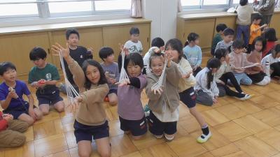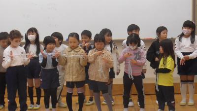 それぞれの学級が選んだ曲に合わせて、老連会から学んだ「昔遊び」を披露します。チームあやとりは、見事な東京タワーを完成していました。昔はこの技を「ほうき」とも呼んだような覚えがありますが、いい名前です。見事な出来なのでスカイツリーとしても名付けちゃってもいいかもしれません。