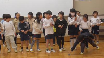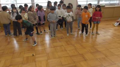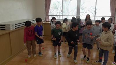 1年生は3月4日に「磯辺校区老人クラブ連合会」をお招きして行います「昔遊び交流会」のリハーサルを南校舎2階「学びの空(大会議室)」で行っていました。廊下ですれ違った1年生に「どこ行くの?」と尋ねたところ、「校長先生もおいでよ!」とさ知ってくれたので、お言葉に甘えて練習会の様子を見せてもらいました。