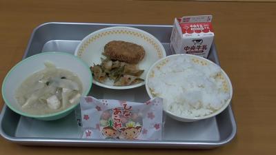 今日の給食は、ごはん、ミンチカツ、茎わかめのごまおかか炒め。白みそ汁、牛乳に「ひなあられ」が提供されました。3月3日にちなんで「ひなあられ」がつくなど、季節感のあるメニューに子どもたちも喜んでいる様子でした。次のア楽しみメニューは、3月10日の赤飯と卒業お祝いケーキでしょうか。3月5日にもミルメークのココア味がつきます。