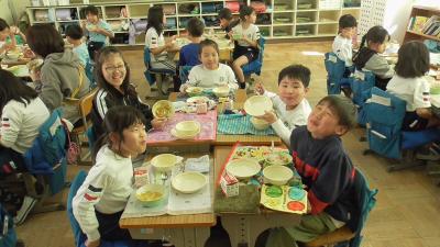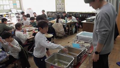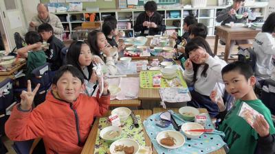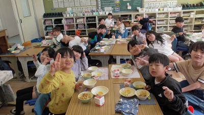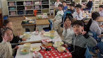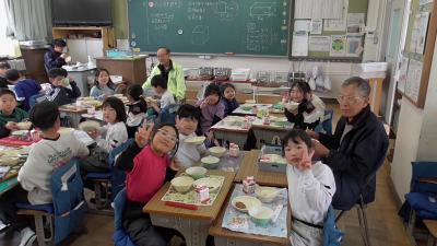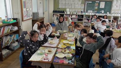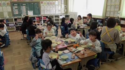 今日は13時10分から、いつも子どもたちの登下校や放課後の安全を守ってくれている「見守り隊」「見回り隊」「PTA安全委員」「PTA執行委員」のボランティアさんによる第3回「見守り見回り全体会」があり、この来校の機会に給食交流を行っていただきました。楽しい給食の時間を一緒に過ごすことができました。