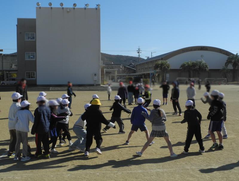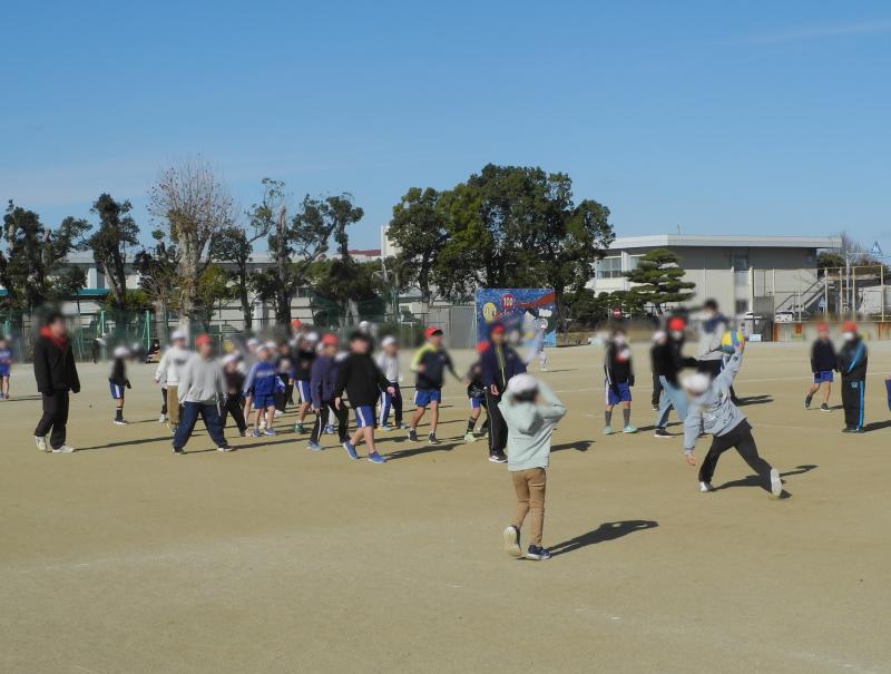 寒風吹く中、運動場では「スポーツ委員会とドッジボール対戦をしよう!」という企画が行われています。