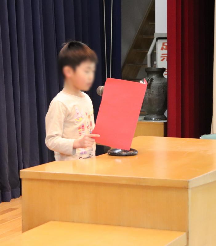 1年生の代表児童は「2学期、僕はヤゴを大事に育てました」と発表しました。