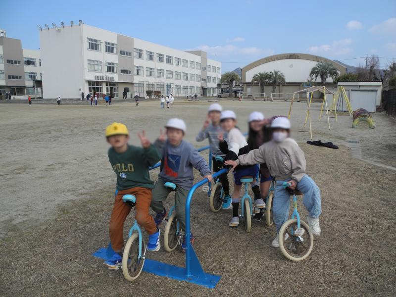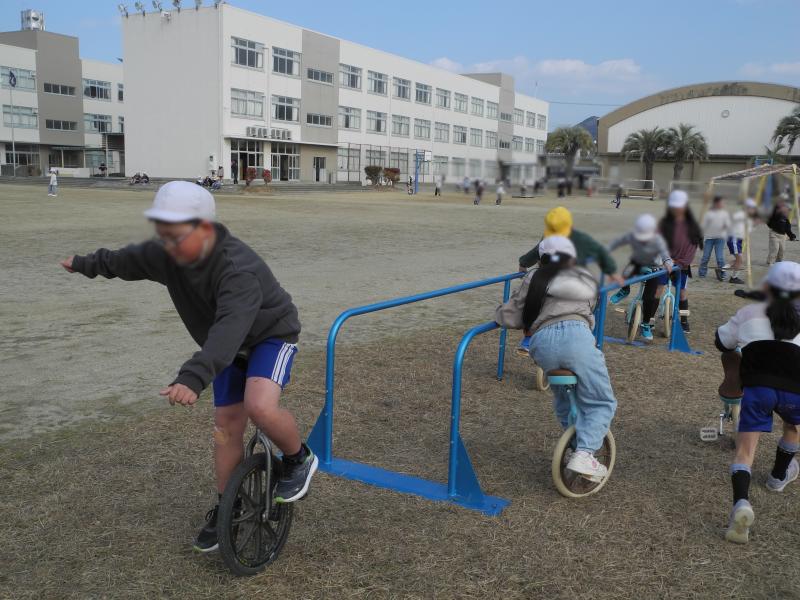運動場の南側に設置し、早速子どもたちは一輪車の練習に励んでします。
