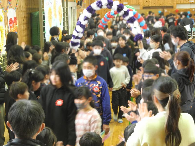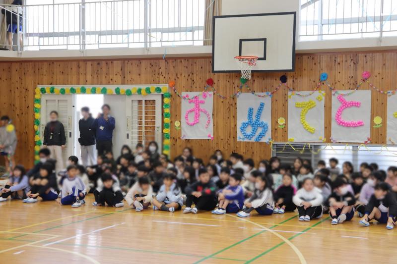 卒業式まであと14日の今日、全校児童と全職員が体育館に集まって「6年生を送る会」を行いました。
