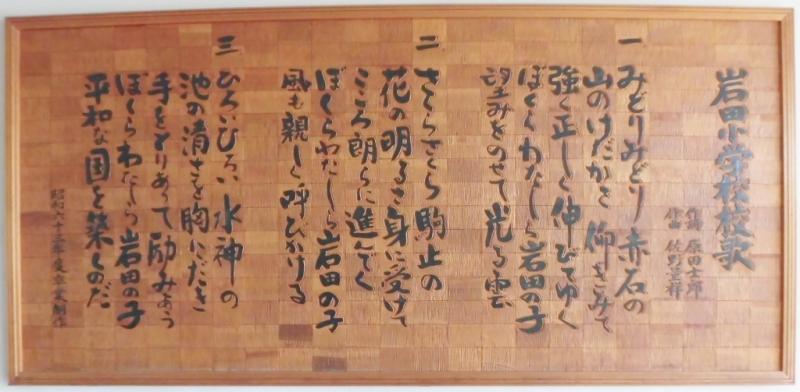 | 1.みどり みどり 赤石の 山のけだかさ 仰ぎみて 強く正しく 伸びてゆく ぼくら わたしら 岩田の子 望みをのせて 光る雲 | 2.さくら さくら 駒止の 花の明るさ 身に受けて こころ朗らに 進んでく ぼくら わたしら 岩田の子 風も親しく 呼びかける | 3.ひろい ひろい 水神の 池の清さを 胸にだき 手をとりあって 励みあう ぼくら わたしら 岩田の子 平和な国を 築くのだ |