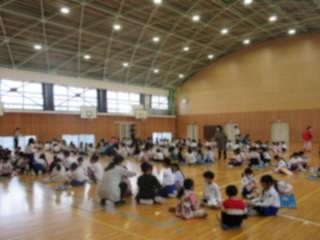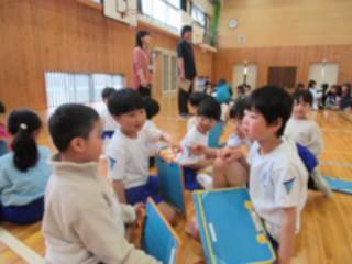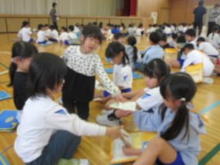 2年生は、入学したばかりの1年生に、「岩田小のことを教えてあげたい」と、学校案内を計画しています。まず、1年生となかよしになるために、名刺交換をしました。名刺には、「よろしくね」「わからないことは、なんでもきいてね」などの言葉や好きな食べ物などの絵がかかれていました。交換した後は、2年生がリードして「嫌いな食べ物はなんですか?」など、インタビューをしたり、簡単なゲームをして楽しんだりしました。優しく頼もしいお兄さん、お姉さんに、1年生は安心した表情でした。