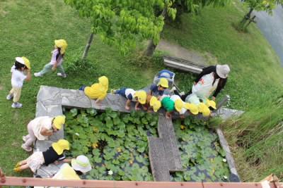 保育士さんたちは、園児たちが池に落ちないかドキドキしていましたが、子どもは夢中になって生き物を探していました。