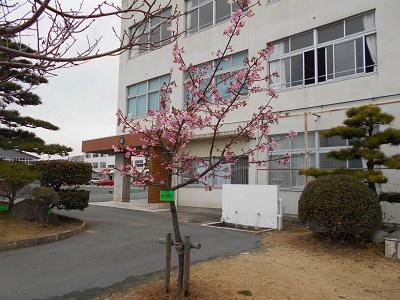晴れ。朝の最低気温2℃。この冷たい朝に校庭のカワヅザクラが2,3つ花を咲かせました。よく見ると他のつぼみもすでに色づいていました。春は確実に近づいていますね。