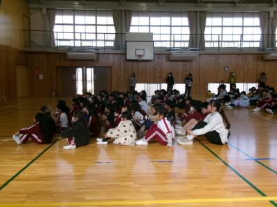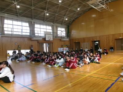 紅白対抗で体育館で行いました。運動場よりも跳びやすいと子どもたちには好評でした。