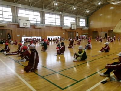 紅白対抗で体育館で行いました。運動場よりも跳びやすいと子どもたちには好評でした。