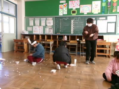 自分が追い出したい心の中の鬼をお面に書き、豆に見立てた、紙の球を投げて追い出しました。