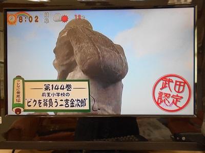 令和2年1月22日(水)8:00。テレビ愛知の朝の情報番組の「コレなに発見伝」というコーナーで、前芝小学校の二宮金次郎像が紹介されました。漁業が盛んだった前芝にふさわしく、背中に魚籠を背負ったところが取り上げられました。金次郎は勤勉と努力のお手本です。