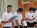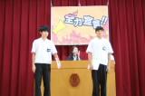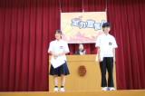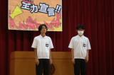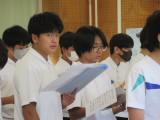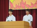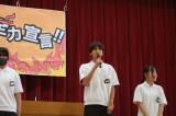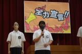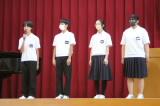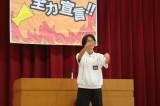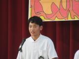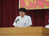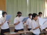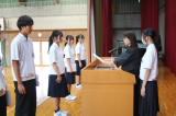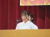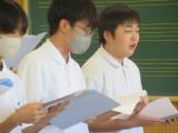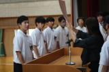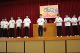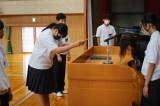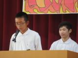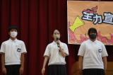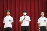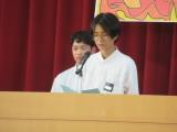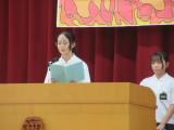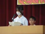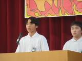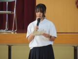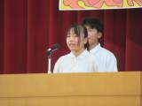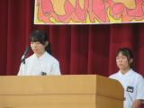 これまで集会などで校歌の指揮者を務めてくれた3年生2名の紹介とともに拍手で感謝の気持ちを伝えました。後期は2年生が指揮者を務めてくれます。
