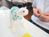 9月30日(火)今、1・3年生は、豊橋まつりに開催される子ども造形パラダイスの作品作りに取り組んでいます。1年生は、テーマ「前芝ふれあい牧場をつくろう」に沿って、思い思いの動物を作っています。針金で骨組みを作った後に新聞紙で肉付けし、その上に紙粘土をつけて形を整えます。今日の6時間目の授業では、色付けした紙粘土を貼り付けたり、ピーピーモザイクというプラスチックのいろんな色の板を手で小さく砕いたものを貼り付けて、動物の模様を表現していました。教室の授業とは違う表情で、真剣に、黙々と作業に取り組んでいました。
