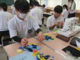 10月7日(火)3年生の家庭科の授業では、幼児のおもちゃ作りに取り組んでいます。1学期に前芝保育園に実習に行ったので、そのイメージをもとにどんなおもちゃを作れば喜んでもらえるのかを考えながら製作しています。ただ、3年生の家庭科は技術と合わせて年間35時間しかないので、それぞれ17.5時間です。ですから、おもちゃ製作にかけられる時間は4時間しかありません。それを子どもたちはきちんとわかっているので、昼休みの時間から製作に取り組んでいました。さすがですね。