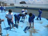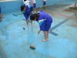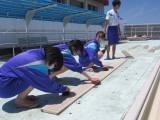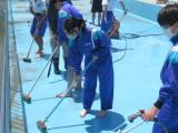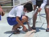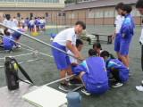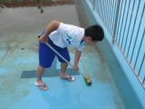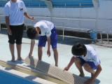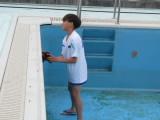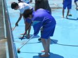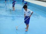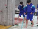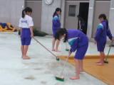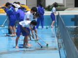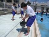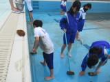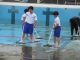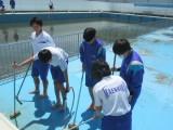毎年恒例のプール掃除に、今回高圧洗浄機が登場し、かなり楽にプール掃除ができるようになりました。それでも、デッキブラシでこすったり、更衣室の掃除をしたり、オーバーフローの水が流れる細かい部分をたわしでこすったりするなど、2年生も3年生も全力でがんばってくれました。明日は、1年生が大プールの掃除をしてくれる予定です。