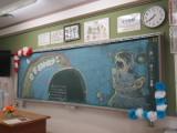 卒業式にむけて、3年生の先生がたをはじめとして、在校生や用務員さんや交通指導員さんも3年生のために準備をしてくださいました。教室に続く階段や廊下には、これまでの思い出の写真がたくさん掲示されていました。教室は、2年生がどんな教室にするのかを前もって計画し、当日も心を込めて準備をしてくれました。背面黒板には普段は時間割や学習内容、宿題が書かれているのですが、2年生が書いてくれたのはとても素敵なメッセージでした。