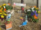 そして、毎年のように用務員さんが卒業式に間に合うようにプランターや花壇に花を植えてくれます。卒業式に合わせて見事に色とりどりの花を咲かせてくれました。正門横には、交通指導員のかたがパンジーを植え、そこにミニチュアの校門、机や椅子、手洗い場などを並べ、最後にはお祝いのメッセージを添えてくれています。