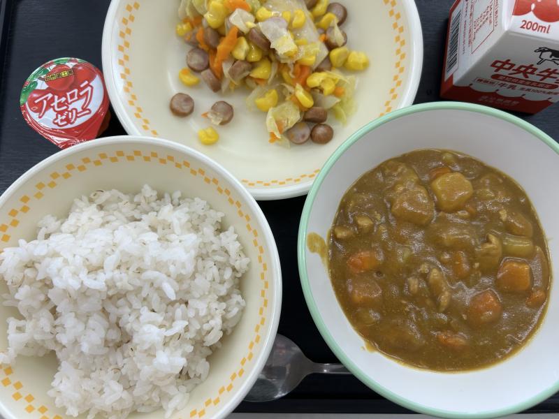 今日の給食は、米粉カレーライス、ウインナーとやさいのソテー、一口アセロラゼリーです。