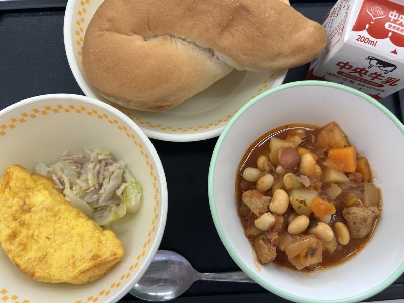 今日の給食は、クロスロール、オムレツ、ハムとキャベツのソテー、ミックスビーンズと豚肉のトマト煮です。