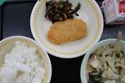 今日の給食は、ごはん、米粉コロッケ、えだまめ、とりだんご汁です。