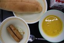今日の給食は、ホットドック(ウインナーのケチャップソースかけ)、かぼちゃのポタージュスープです。