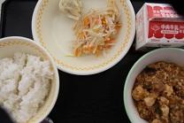 今日の給食は、麦ごはん、すりみ入りコーンしゅうまい、ゆでやさい、マーボー豆腐です。
