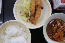 今日の給食は、ごはん、子持ちししゃもフライ、ゆでやさい、豚汁です。