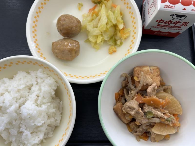 今日の給食は、ごはん、レバー入りつくね、そえやさい、生揚げとだいこんのいため煮です。