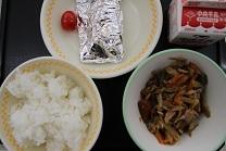 今日の給食は、ごはん、さんまの銀紙焼き、ミニトマト、五目きんぴらです。