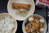 今日の給食は、ごはん、青じそ春巻、もやしいため、中華いため煮です。