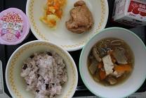 今日の給食は、赤飯、とりのてり焼き、そえやさい、五目汁、お祝いいちごゼリーです。