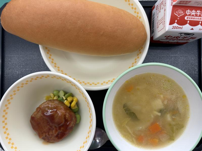 今日の給食は、ミルクロール、ハンバーグのワインソースかけ、えだまめとコーンのソテー、ABCマカロニスープです。