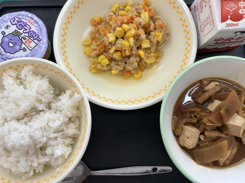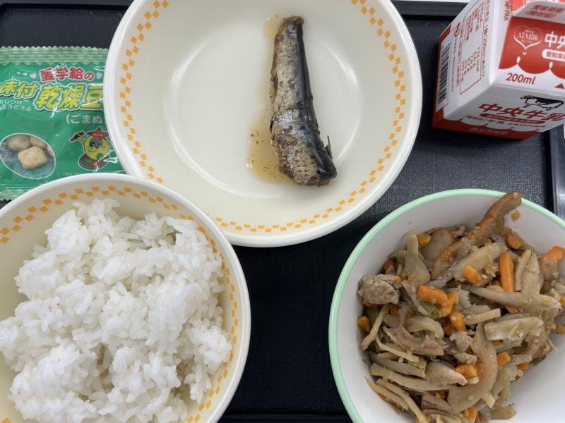 今日の給食は、ごはん、いわしの梅煮、五目きんぴら、味付乾燥豆腐です。