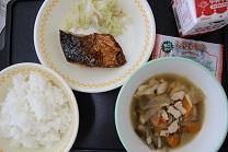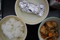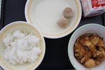 今日の給食は、ごはん、さんまの銀紙焼き、肉だんごのうま煮です。