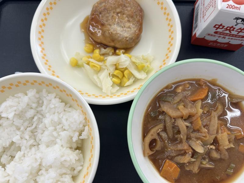 今日の給食は、ごはん、ハンバーグの和風あんかけ、そえやさい、根菜汁です。