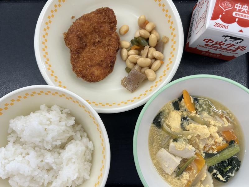 今日の給食は、ごはん、チキンカツ、大豆の煮物、かき玉汁です。
