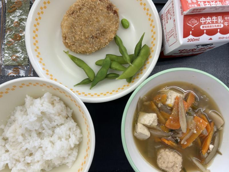 今日の給食は、ごはん、米粉コロッケ、えだまめ、とりだんご汁です。