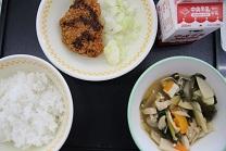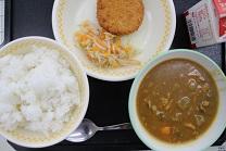 今日の給食は、ごはん、キャベツミンチカツ、そえやさい、とうがんの米粉カレースープです。