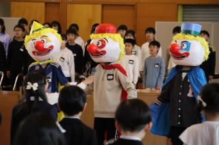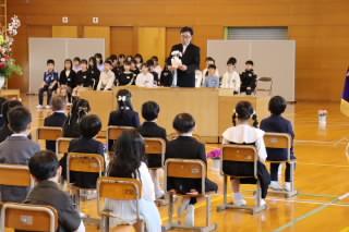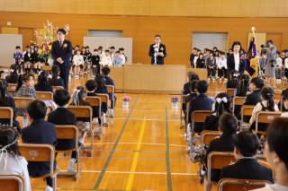 〈体育館で入学式が始まり、校長先生、PTA会長そして6年生からのメッセージがありました。また、向山小のマスコットキャラクター、かかまる・トライ・ねばりんも登場して会場を盛り上げました。〉