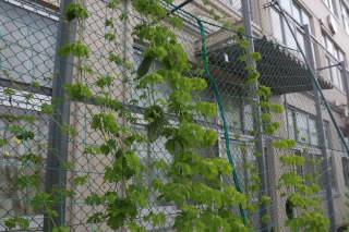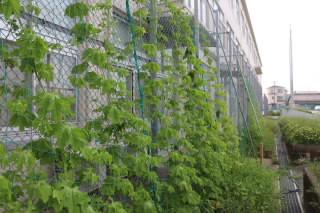 4年生が育てているゴーヤも太陽の照りつける暑さをものともせず、ぐんぐんツルを伸ばし、成長していっています。緑色のごつごつしたゴーヤの実もつき始めました。